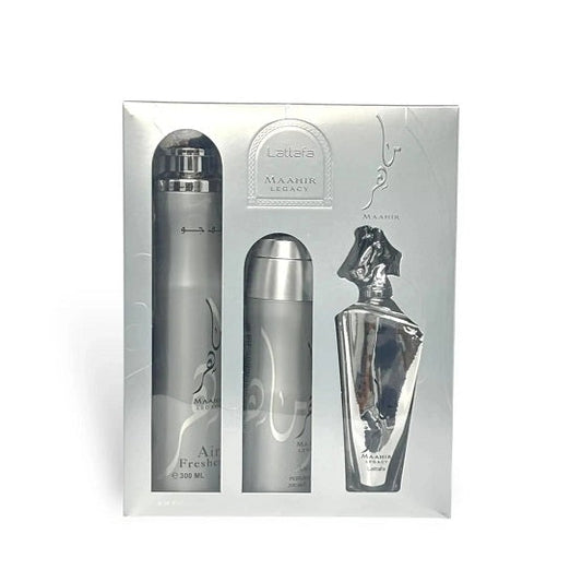 The Maahir Legacy 3PCS Gift Set by Lattafa offers a complete fragrance experience for the modern individual....