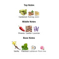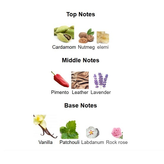 Base notes are Vanilla, Patchouli, Labdanum and Rock rose.