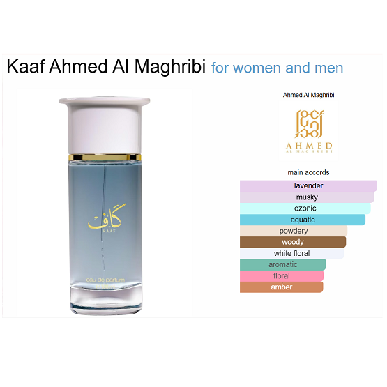 Kaaf by Ahmed Al Maghribi is a fragrance for women and men. Kaaf was launched in 2022. Top notes are Lavender, Watermelon, Sicilian Orange and Red Fruits; middle notes are Lily of the Valley, Lotus and Jasmine; base notes are White Musk, Sandalwood and Ambroxan.