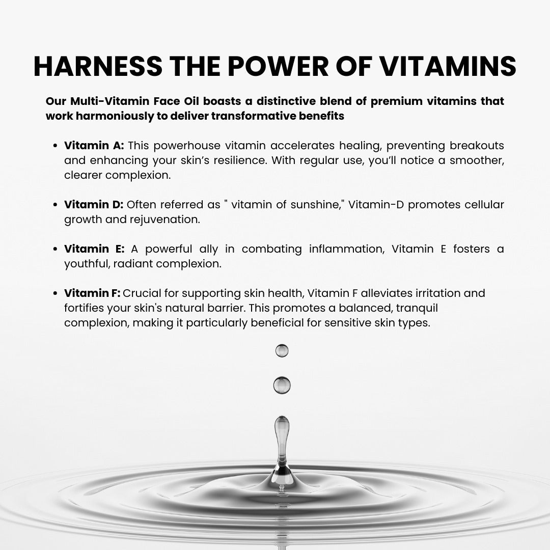 Our Multi-Vitamin Face Oil boasts a distinctive blend of premium vitamins that work harmoniously to deliver transformative benefits: