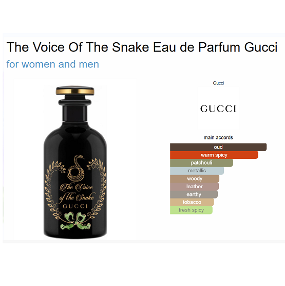 The Voice Of The Snake Eau de Parfum by Gucci is a Woody Spicy fragrance for women and men. The Voice Of The Snake Eau de Parfum was launched in 2019. The nose behind this fragrance is Alberto Morillas.