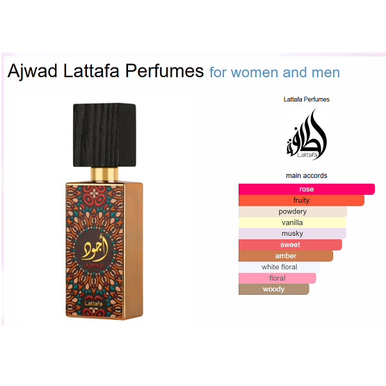 Ajwad by Lattafa Perfumes is a Woody Aromatic fragrance for women and men. Ajwad was launched in 2021. Top note is Fruity Notes; middle notes are Rose and Jasmine; base notes are Vanilla, Musk, Amber and Cedar.