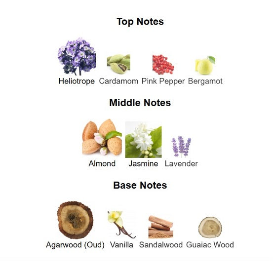 Top notes are Heliotrope, Cardamom, Pink Pepper and Bergamot; Middle notes are Almond, Jasmine and Lavender; base notes are Agarwood (Oud), Vanilla, Sandalwood and Guaiac Wood.