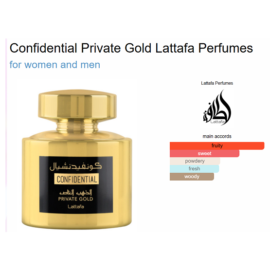 Confidential Private Gold by Lattafa Perfumes is a Chypre Fruity fragrance for women and men. Confidential Private Gold was launched in 2020. Top notes are Peach, Pear, Passionfruit, Raspberry and Cassis; middle note is Lily of the Valley; base notes are Musk, Vanilla, Sandalwood, Patchouli and Heliotrope.
