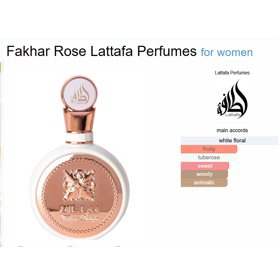 Fakhar Rose by Lattafa Perfumes is a Floral fragrance for women. This is a new fragrance. Fakhar Rose was launched in 2022. Top notes are Fruits, Lily, Pomegranate and Aldehydes; middle notes are Tuberose, Jasmine, Gardenia, Ylang-Ylang, Honeysuckle, Rose and Peony; base notes are Vanilla, White Musk, Sandalwood and Ambroxan.