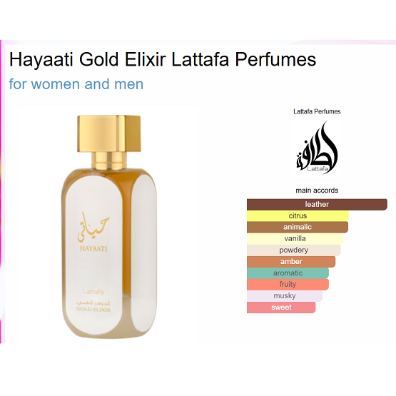 Hayaati Gold Elixir by Lattafa Perfumes is a fragrance for women and men. Top notes are Bergamot, Grapefruit and Cassis; middle notes are Leather, Peach and Saffron; base notes are Vanilla, Amber, Musk and Vetiver.