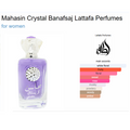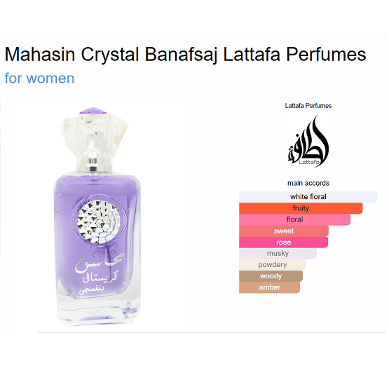 Mahasin Crystal Banafsaj by Lattafa Perfumes is a Floral fragrance for women. Top notes are Raspberry and Rose; middle notes are Freesia, Tiare Flower, Honeysuckle and Rose; base notes are Musk, Cedar and Amber.