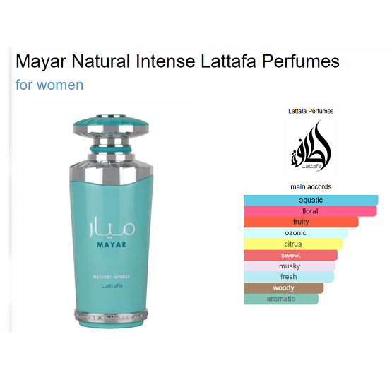 Mayar Natural Intense by Lattafa Perfumes is a fragrance for women. This is a new fragrance. Mayar Natural Intense was launched in 2024. Top notes are Fig, Green Tangerine, Melon and Coconut Water; middle notes are Lotus, Water Lily and Jasmine; base notes are Ambroxan, Musk, Sandalwood and Vanilla.