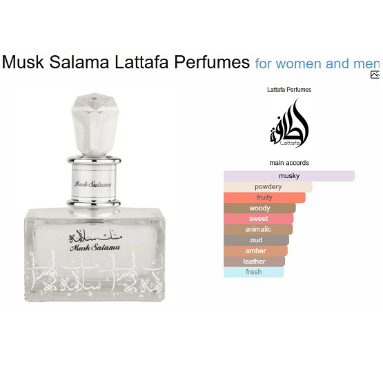 Musk Salama by Lattafa Perfumes is a Aromatic Aquatic fragrance for women and men. This is a new fragrance. Musk Salama was launched in 2022. Top notes are White Musk and Fruits; middle notes are White Musk and Amber; base notes are Woodsy Notes, Agarwood (Oud), Moscow Mule and Leather.