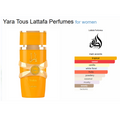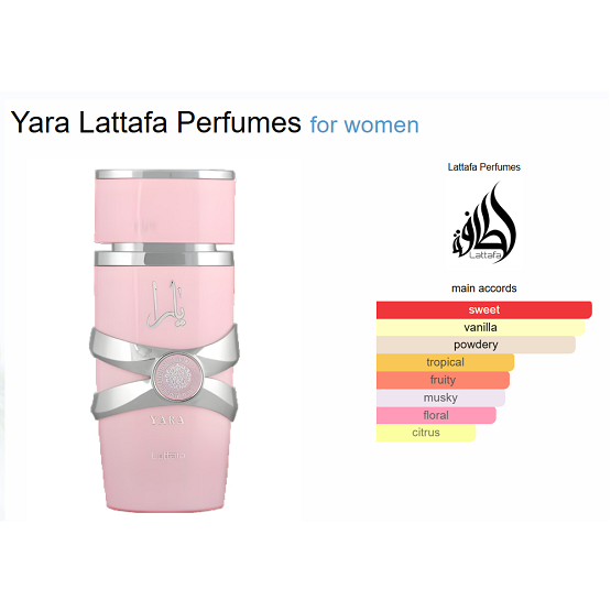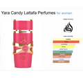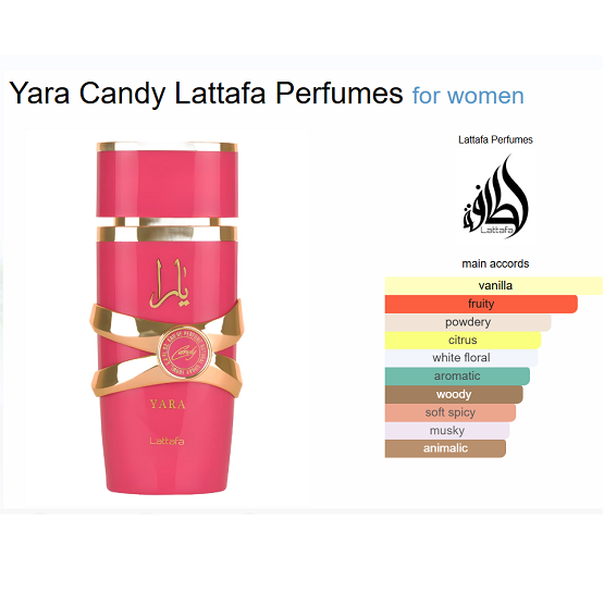 - Yara Candy • Top Notes: Green Mandarin, Blackcurrant • Heart Notes: Gardenia, Strawberry Fizz Candy • Base Notes: Sandalwood, Vanilla Syrup, Musk, Amber