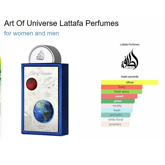 Art Of Universe by Lattafa Perfumes is a Citrus Aromatic fragrance for women and men. This is a new fragrance. Art Of Universe was launched in 2025. Top notes are Mandarin, Ginger, Bergamot and Mint; middle notes are Pear and Orange Blossom; base notes are Musk, Amber and Cedar.