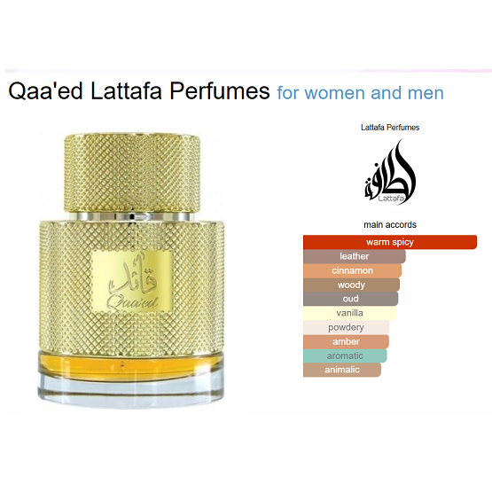 Qaa'ed by Lattafa Perfumes is a Oriental fragrance for women and men. Qaa'ed was launched in 2018. Top notes are Cinnamon, Cardamom and Bergamot; middle notes are Saffron, Sandalwood, Cedar and Carnation; base notes are Agarwood (Oud), Vanilla, Leather and Amber.