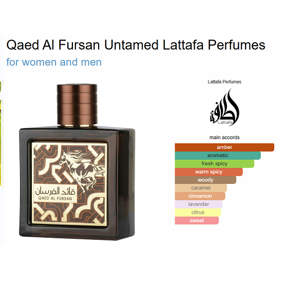 Qaed Al Fursan Untamed by Lattafa Perfumes is a Woody Spicy fragrance for women and men. This is a new fragrance. Qaed Al Fursan Untamed was launched in 2025. Top notes are Cinnamon, Mandarin, Nutmeg and Cardamom; middle notes are Caramel, Lavender, Geranium, Clary Sage and Cypress; base notes are Labdanum, Olibanum, Amber, Vetiver and Cedarwood.