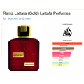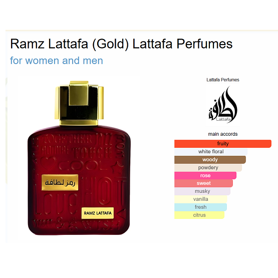 Ramz Lattafa (Gold) by Lattafa Perfumes is a fragrance for women and men. Top notes are Apple, Peach, Pear, Black Currant and Sweet Orange; middle notes are Rose, Jasmine Sambac and Orange Blossom; base notes are Sandalwood, White Musk, Vanilla and Patchouli.