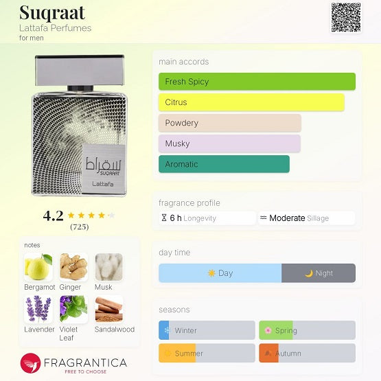 Suqraat by Lattafa Perfumes is a Aromatic fragrance for men. This is a new fragrance. Suqraat was launched in 2022.