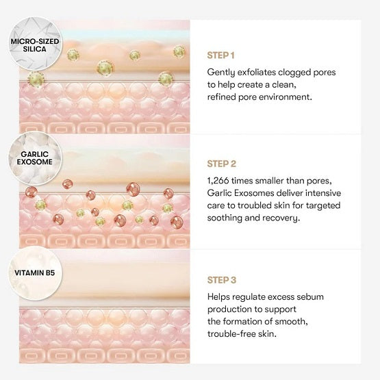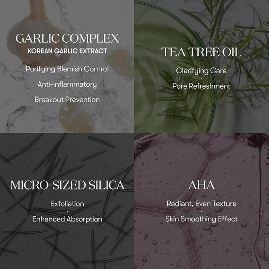 - Garlic Exosome Complex: Contains Garlic Allicin to calm inflamed skin and fight bacteria